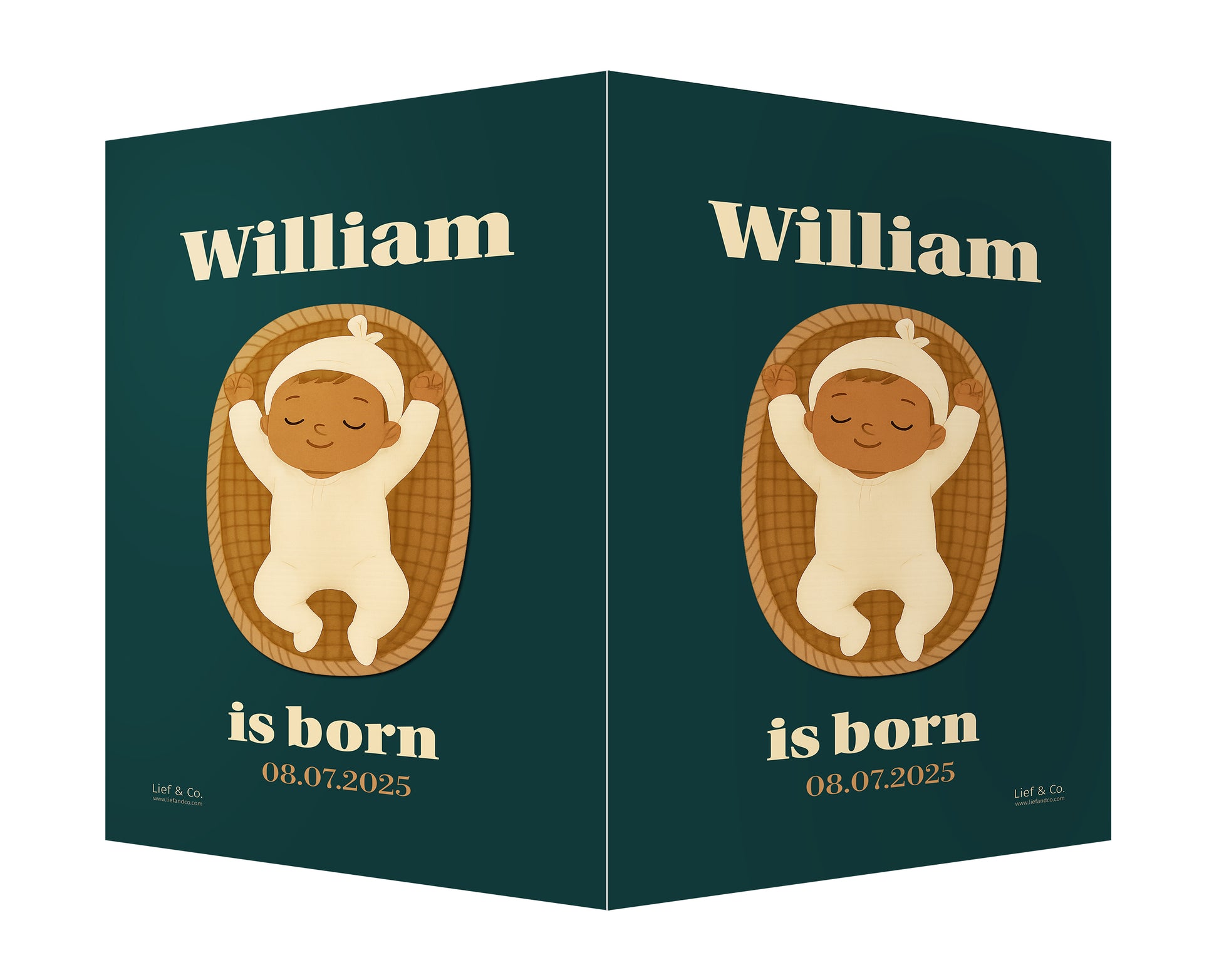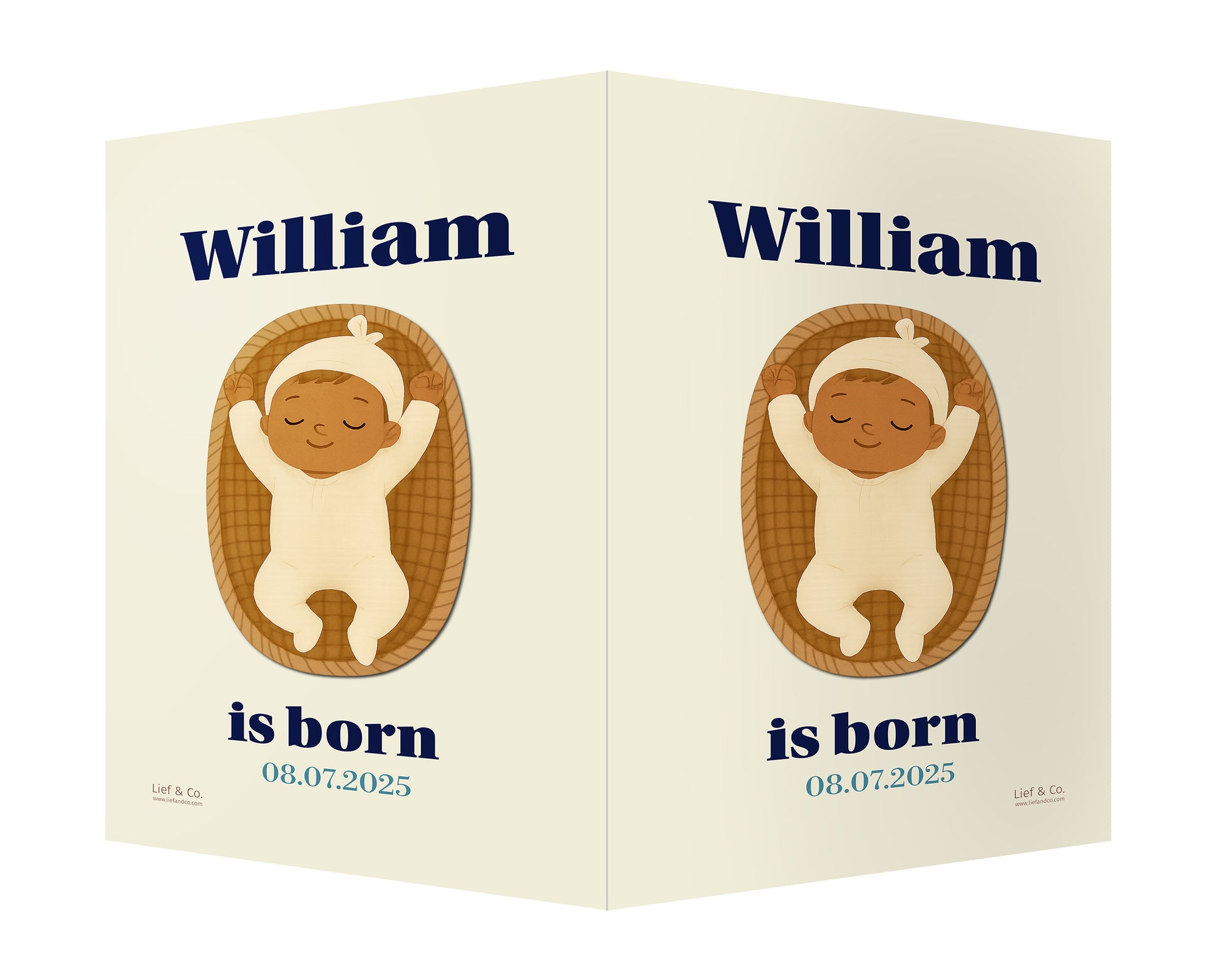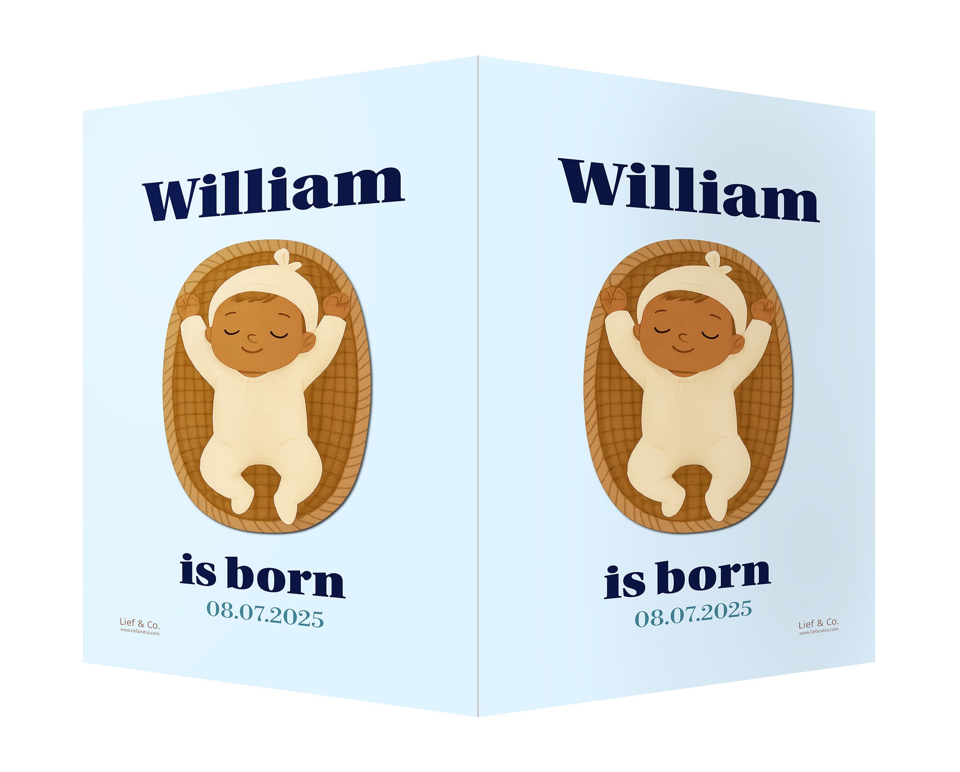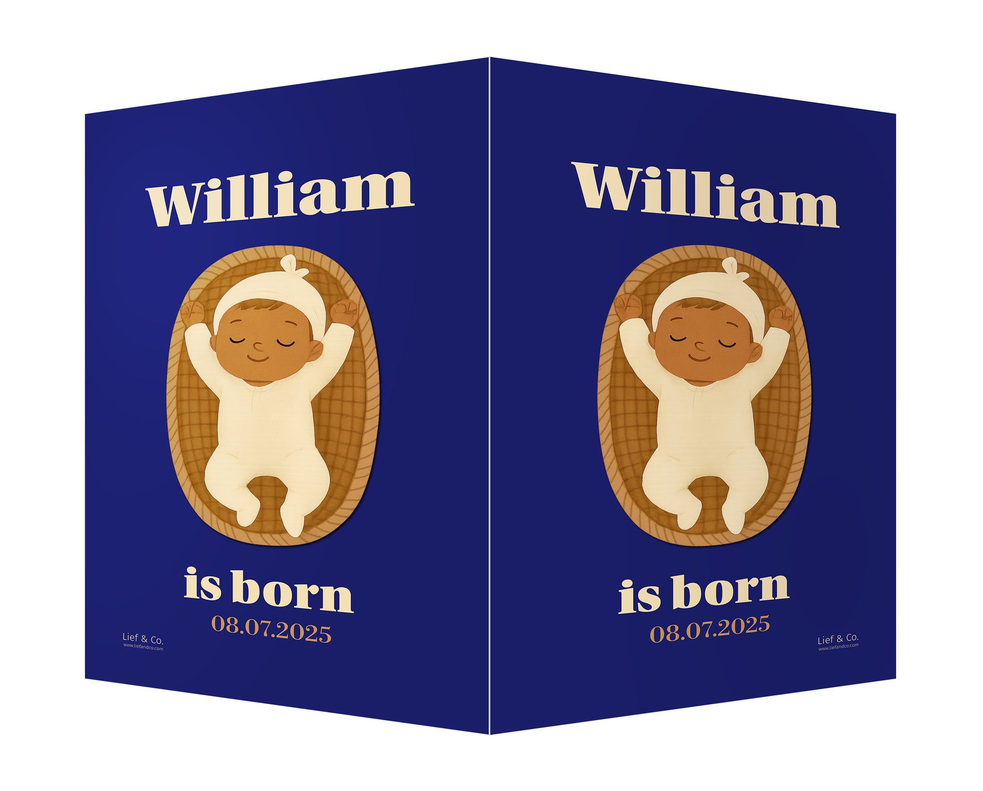A striking birth announcement sign featuring a peacefully sleeping baby in a woven basket, set against a rich navy blue background. This customizable design blends elegance with warmth — a timeless keepsake to celebrate your baby’s arrival.