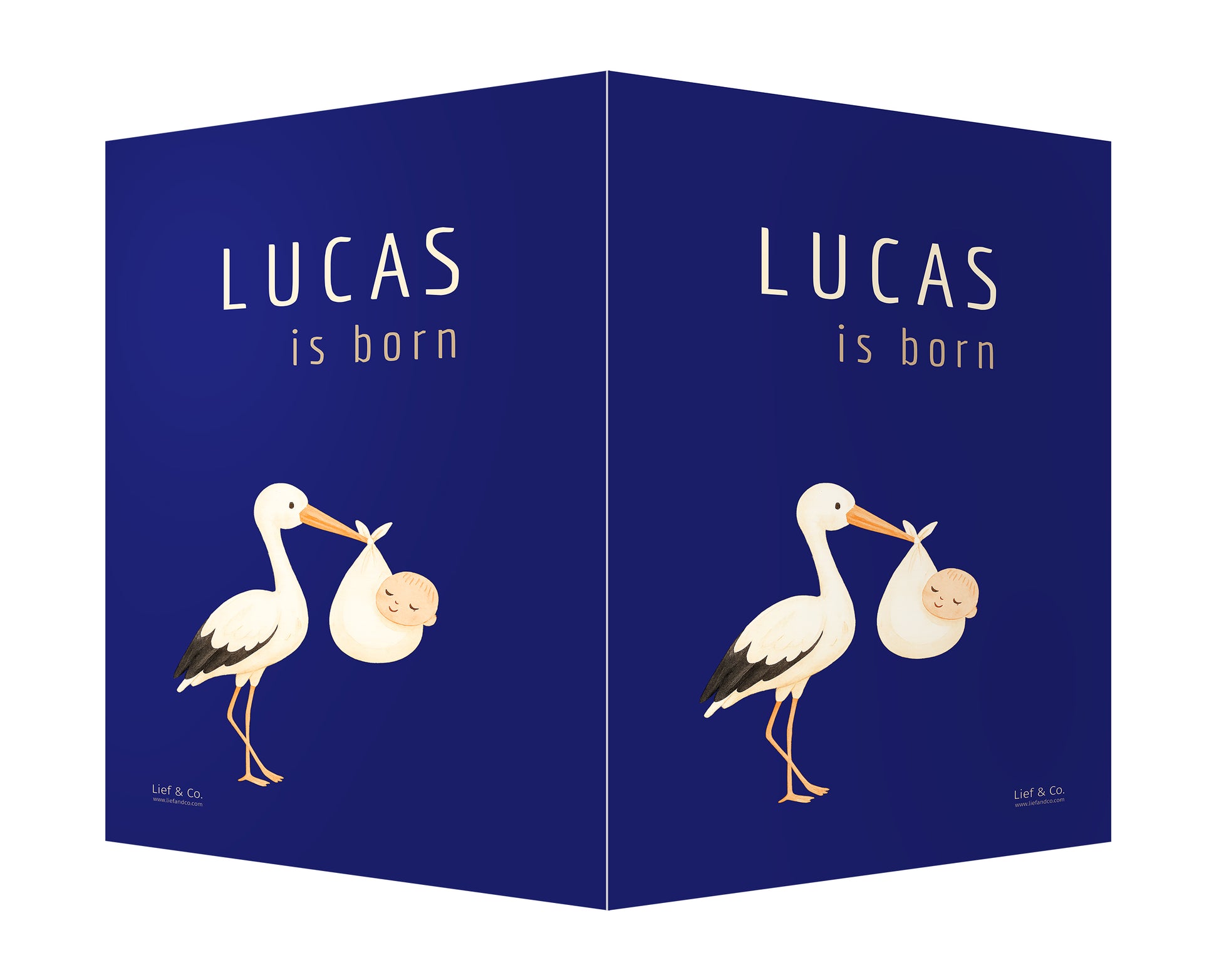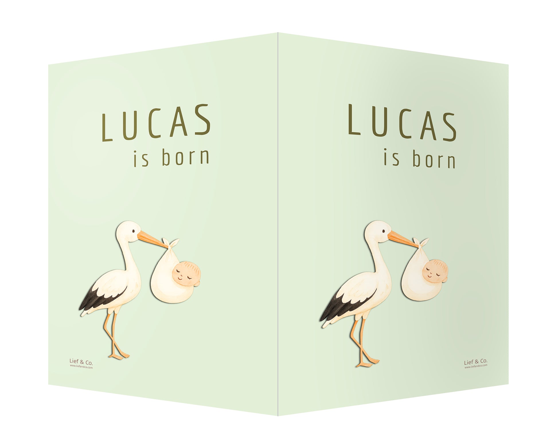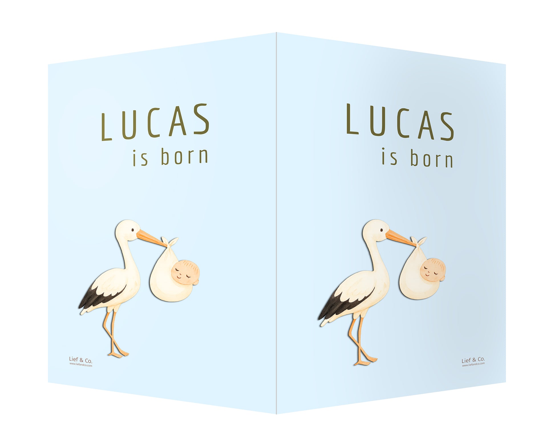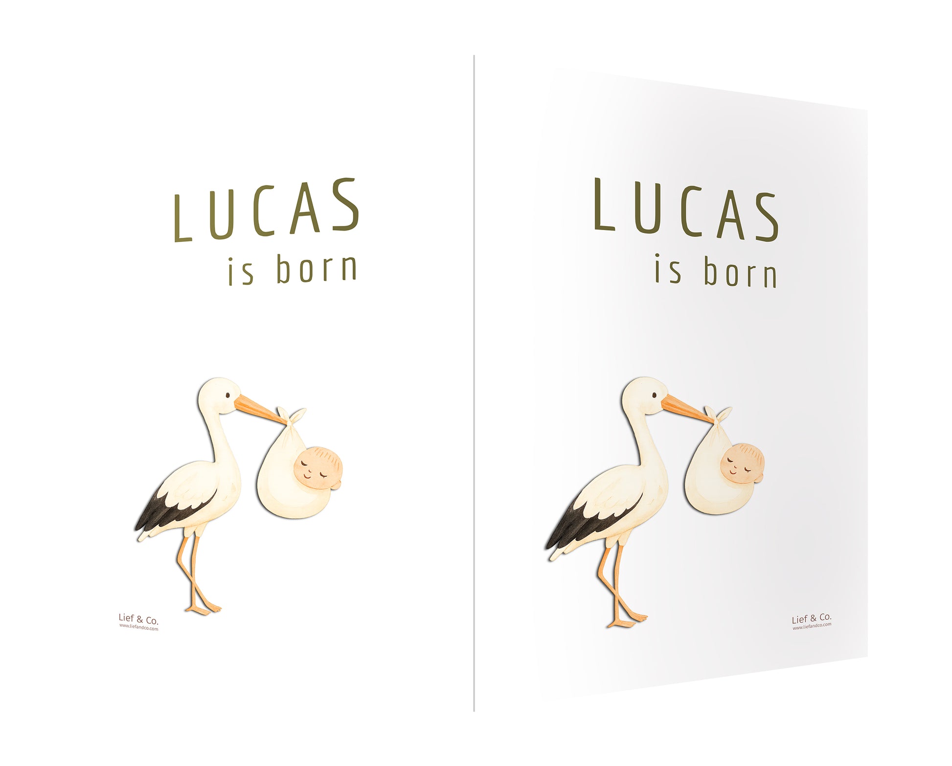 A timeless birth announcement sign featuring a stork carrying a swaddled baby in a simple cream wrap. With its clean white backdrop and traditional design, this customizable print is a classic keepsake to celebrate your little one’s arrival.