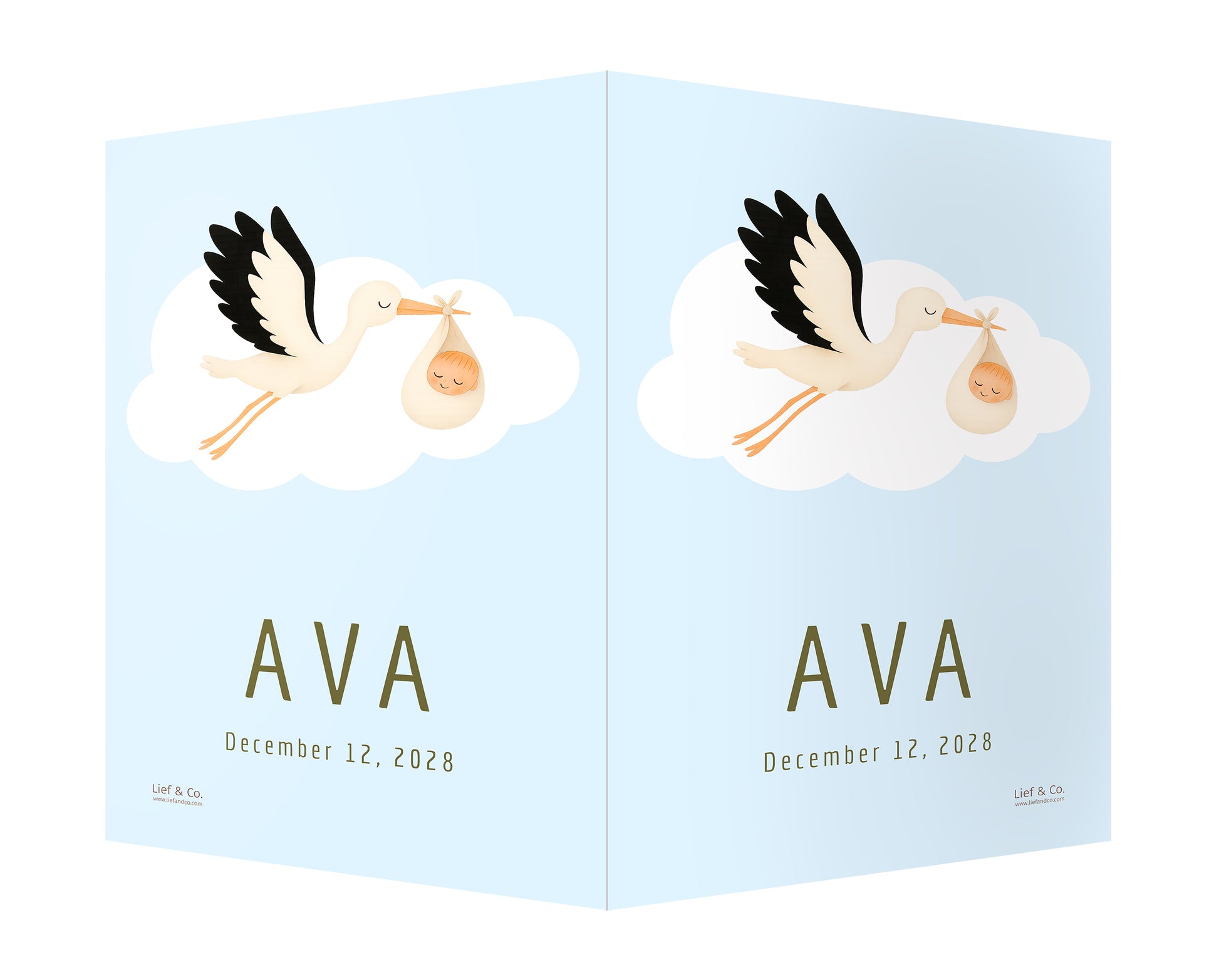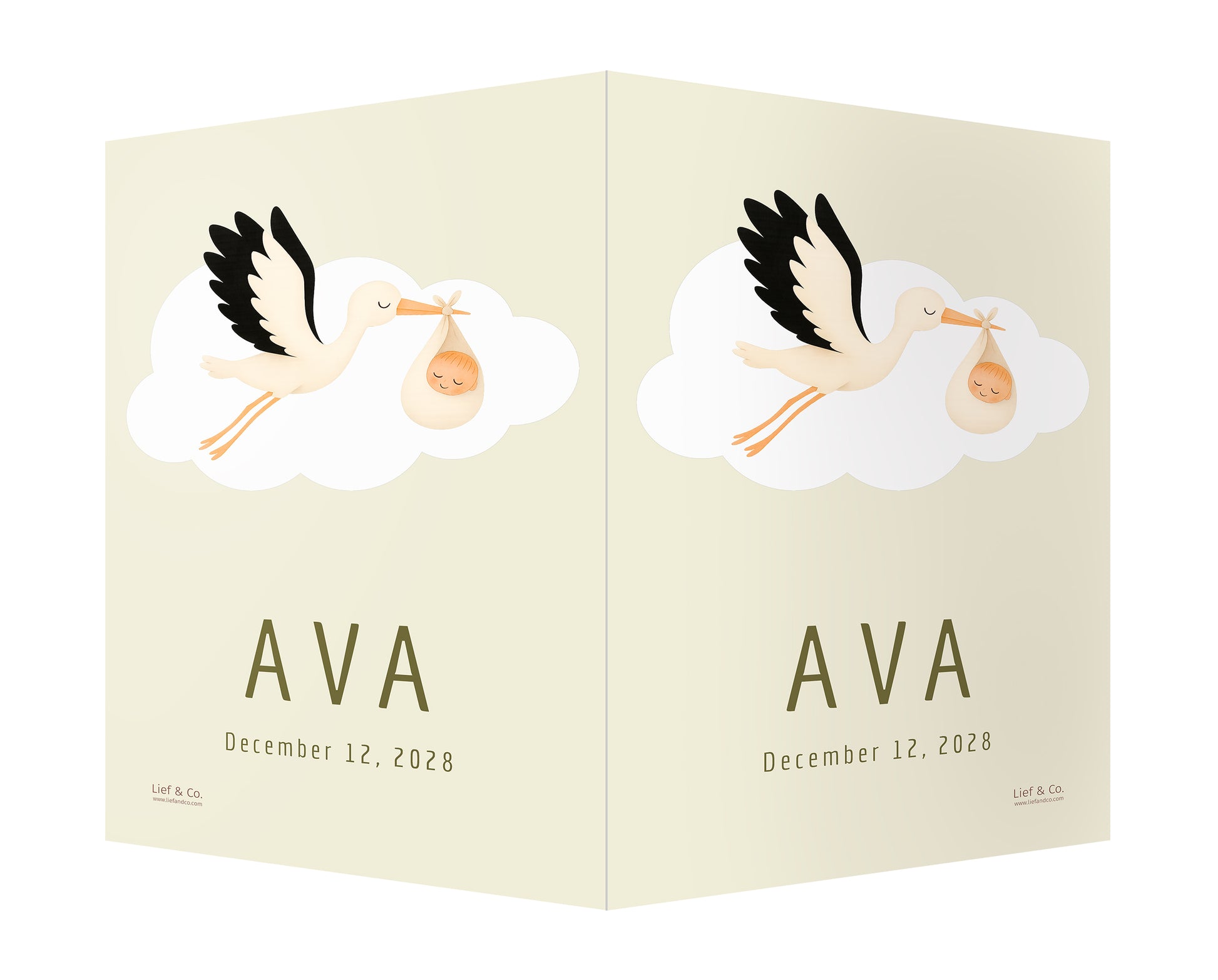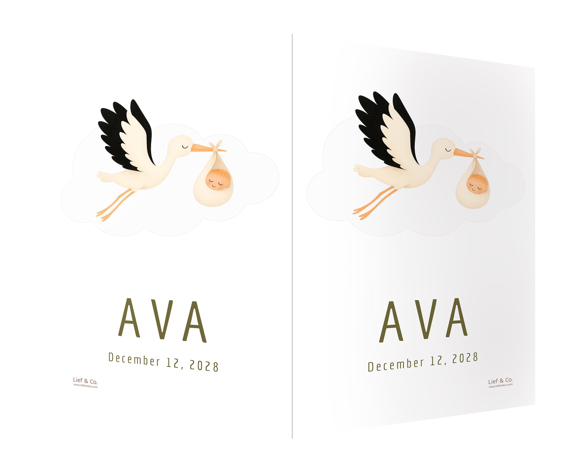 A joyful birth announcement sign featuring a stork in flight, carrying a swaddled baby in a soft cream wrap. With its clean white backdrop and timeless storytelling charm, this customizable print is a delightful keepsake to celebrate your baby’s arrival.