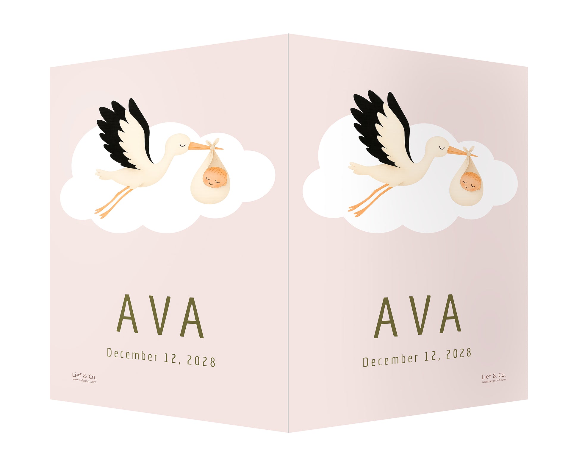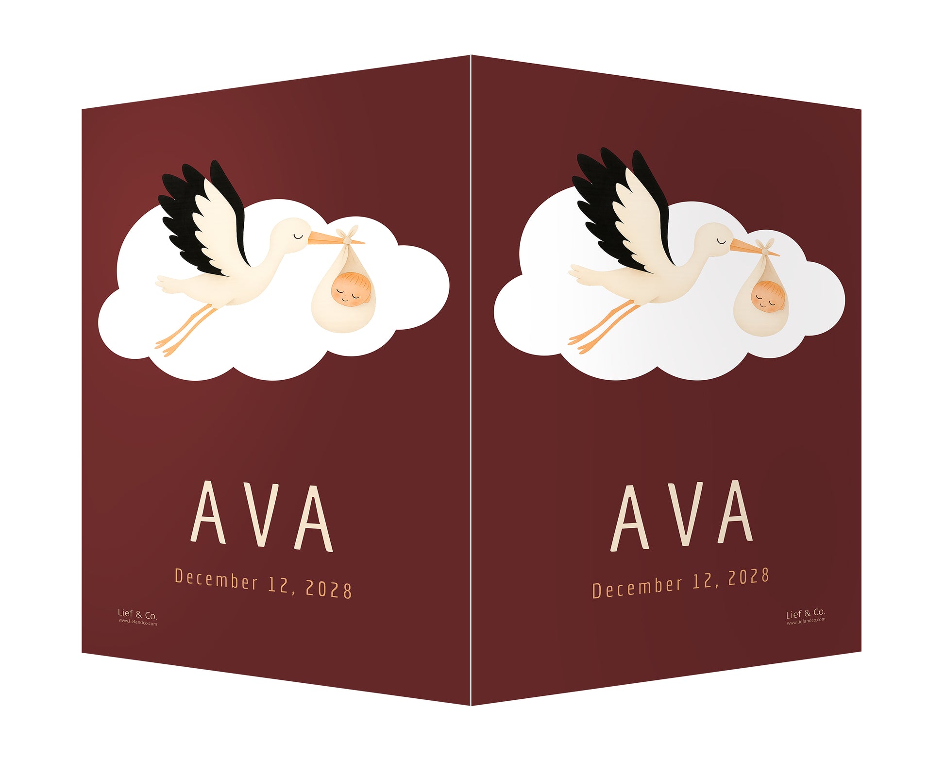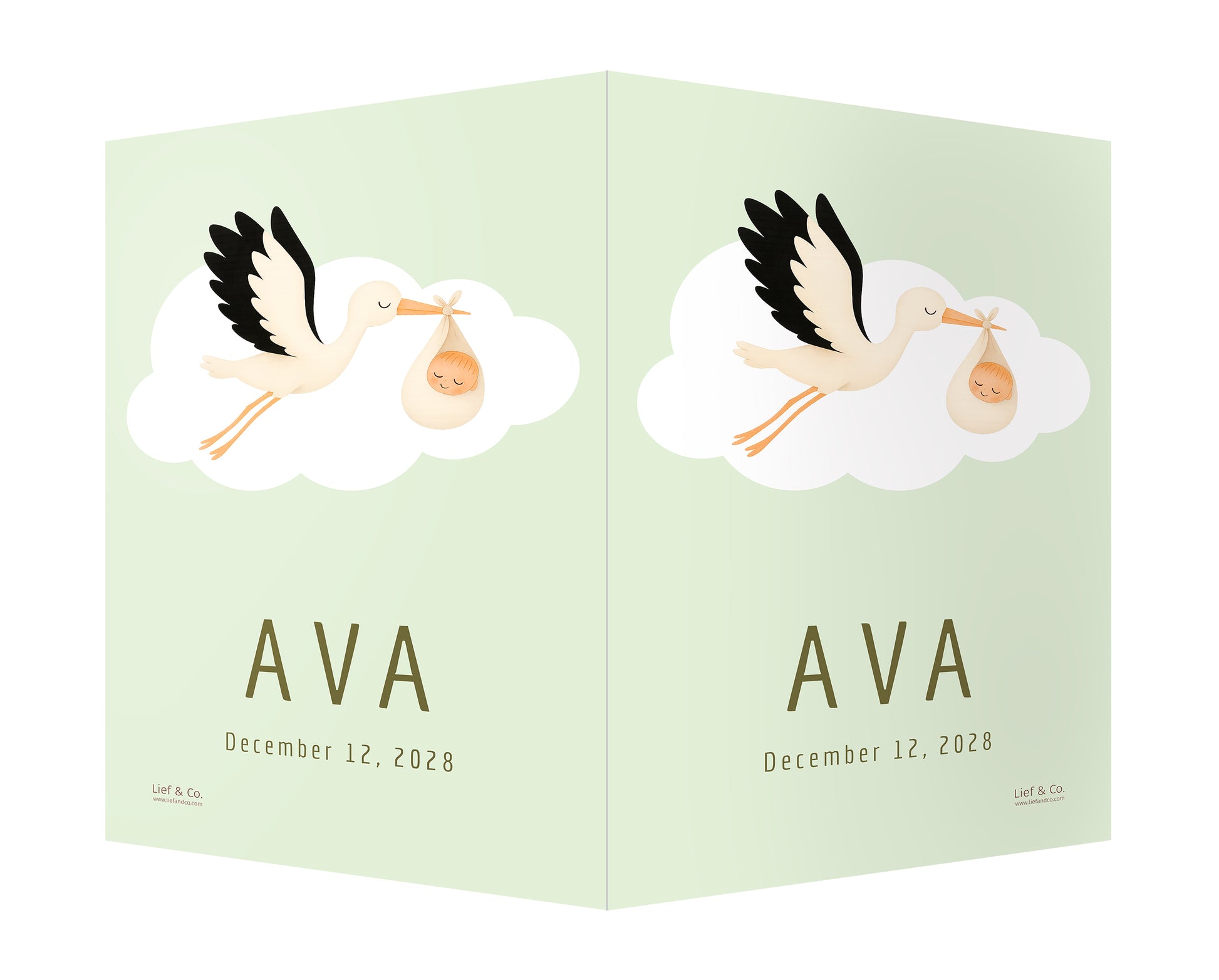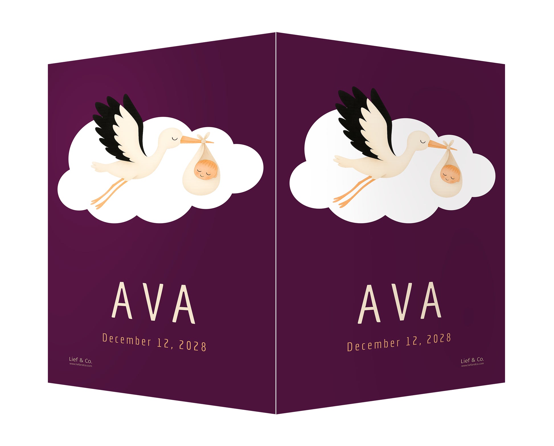 A joyful birth announcement sign featuring a stork in flight, carrying a swaddled baby in a soft cream wrap. With its clean white backdrop and timeless storytelling charm, this customizable print is a delightful keepsake to celebrate your baby’s arrival.
