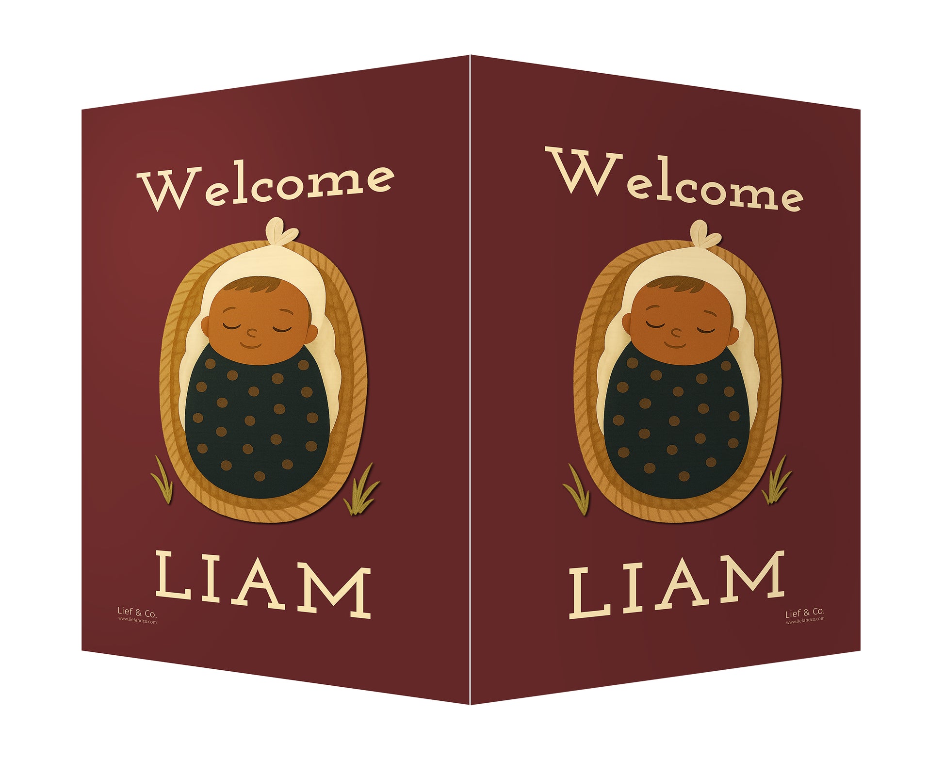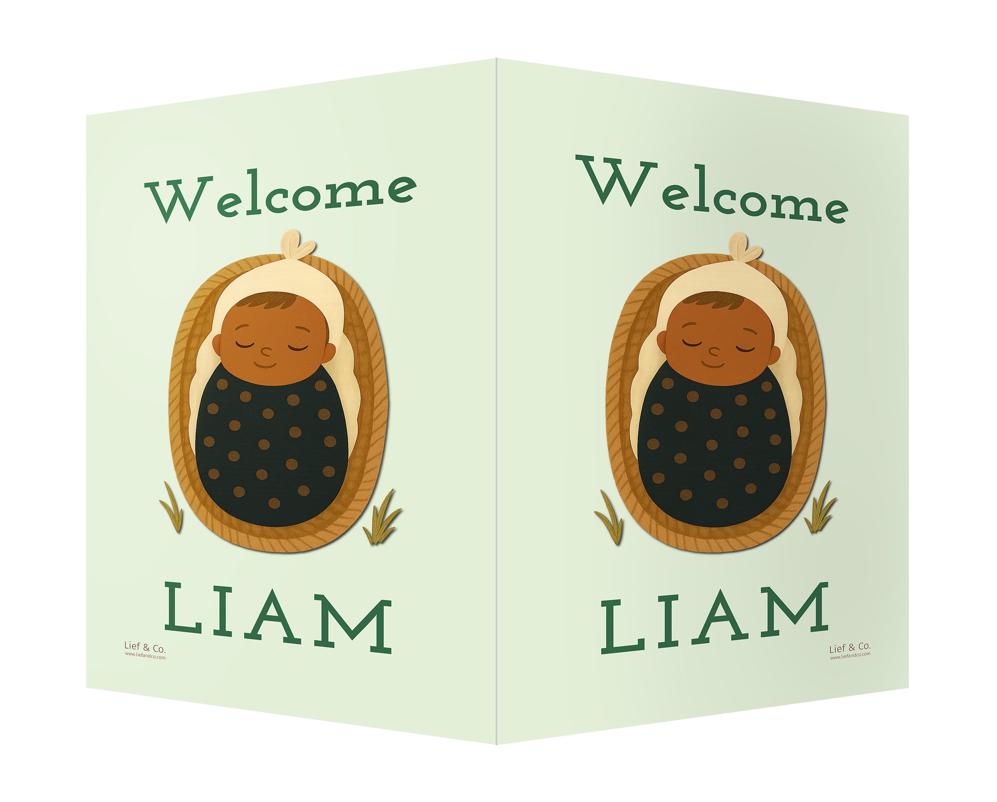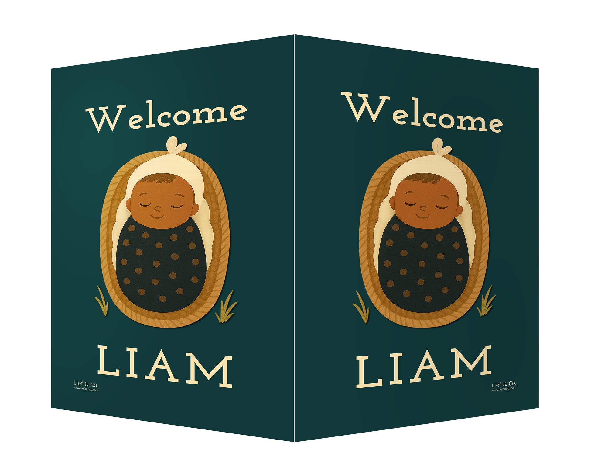 A warm and rustic birth announcement sign featuring a swaddled baby in a dotted blanket, resting in a woven basket against a deep green backdrop. This customizable design combines earthy tones with cozy charm — a timeless keepsake to celebrate your little one’s arrival.