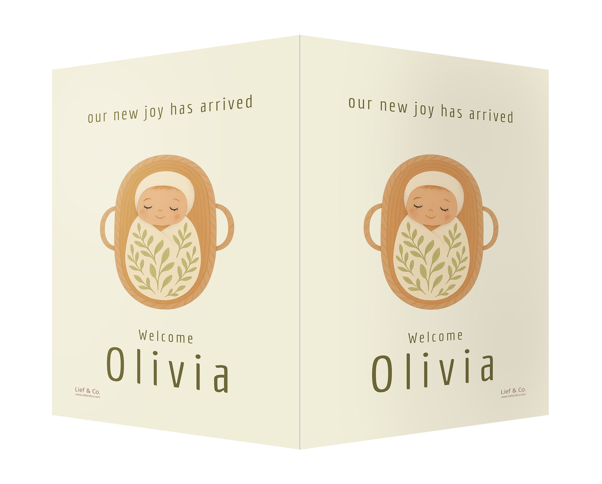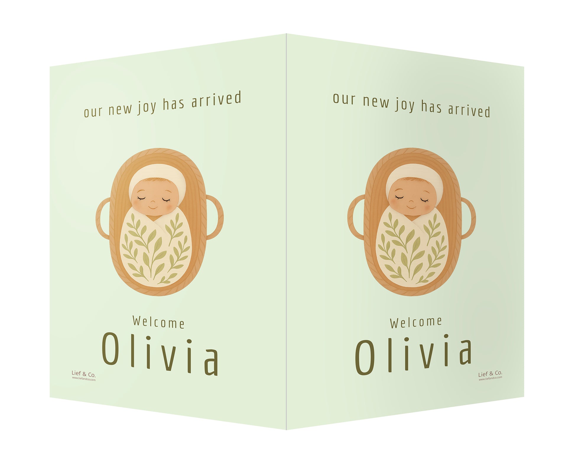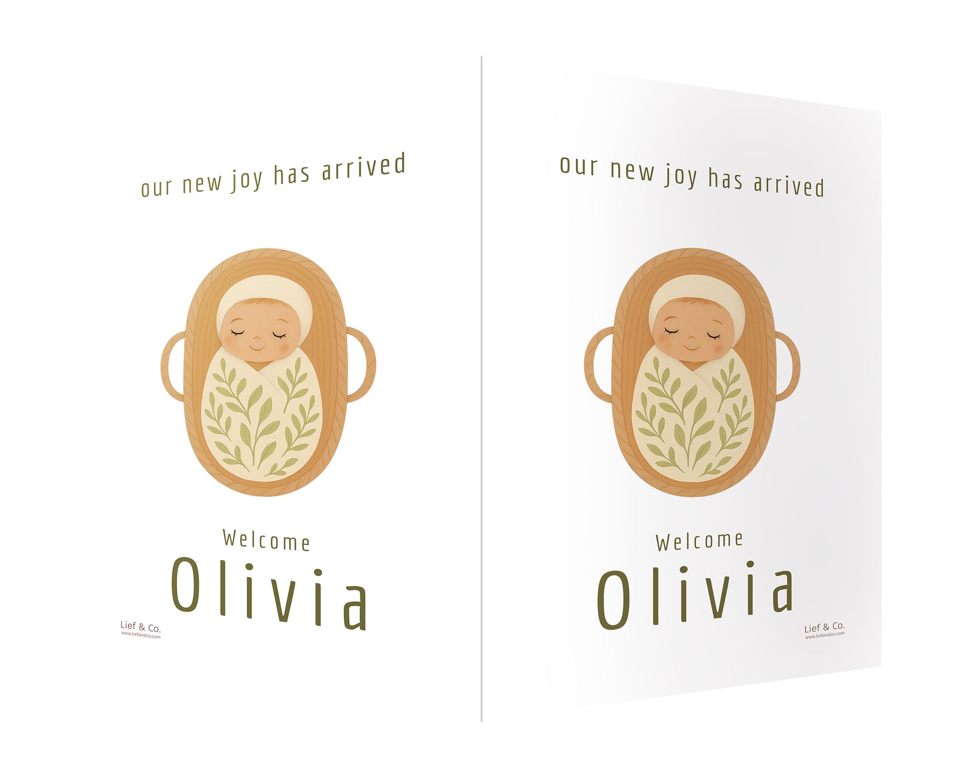 A joyful birth announcement sign featuring a swaddled baby in a leafy green wrap, peacefully resting in a rustic basket. With its crisp white backdrop and nature-inspired details, this customizable design is a fresh and timeless keepsake to celebrate your little one’s arrival.