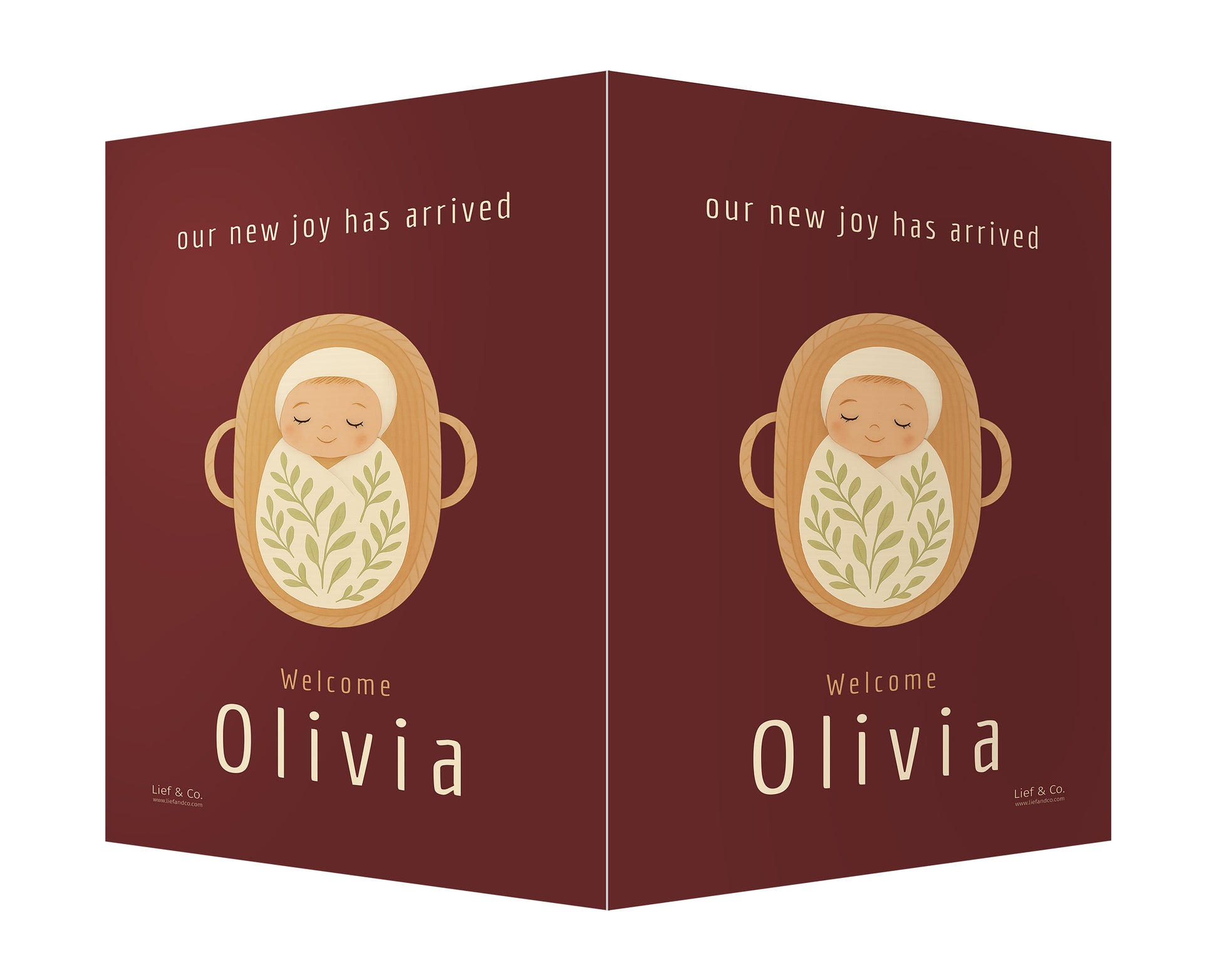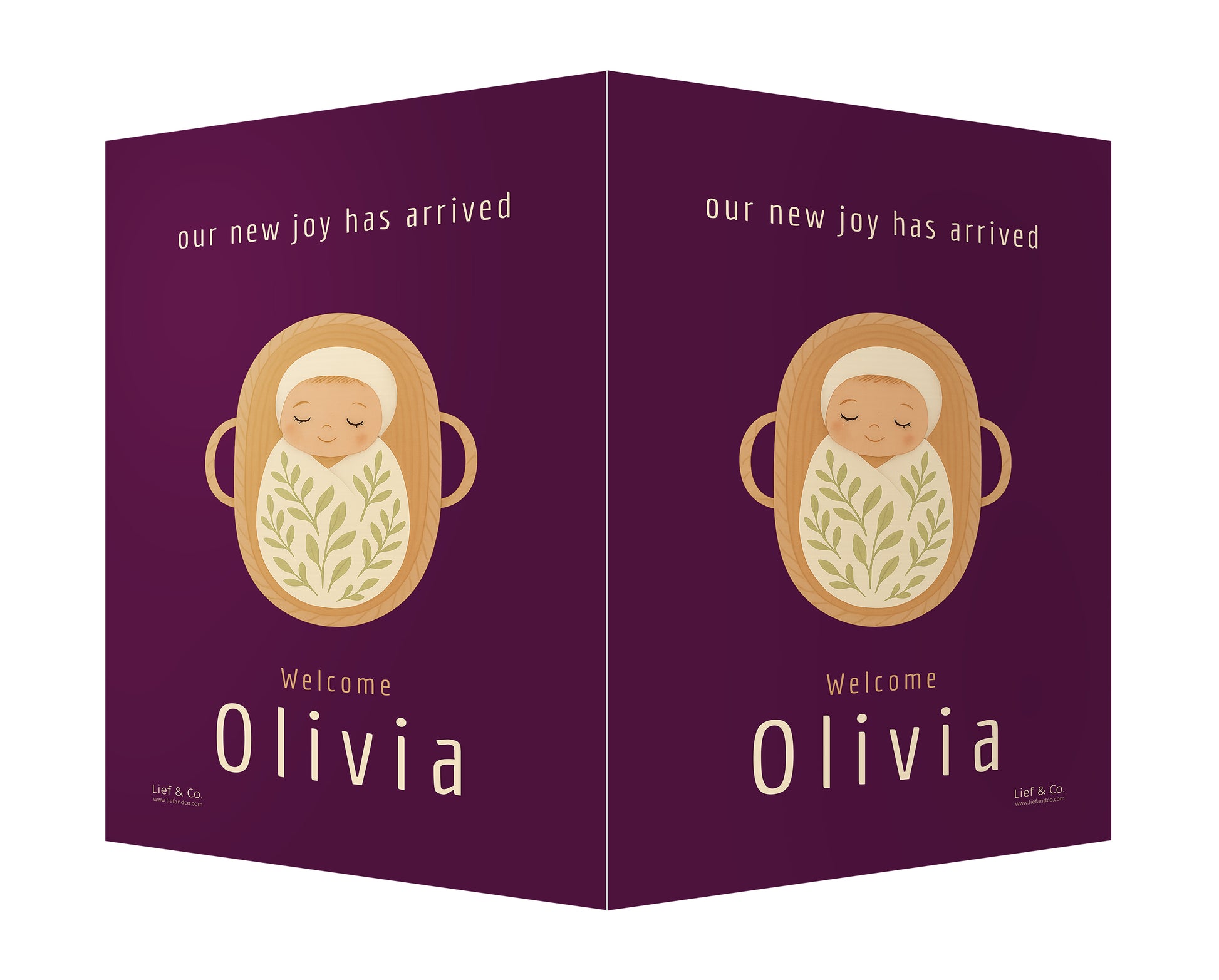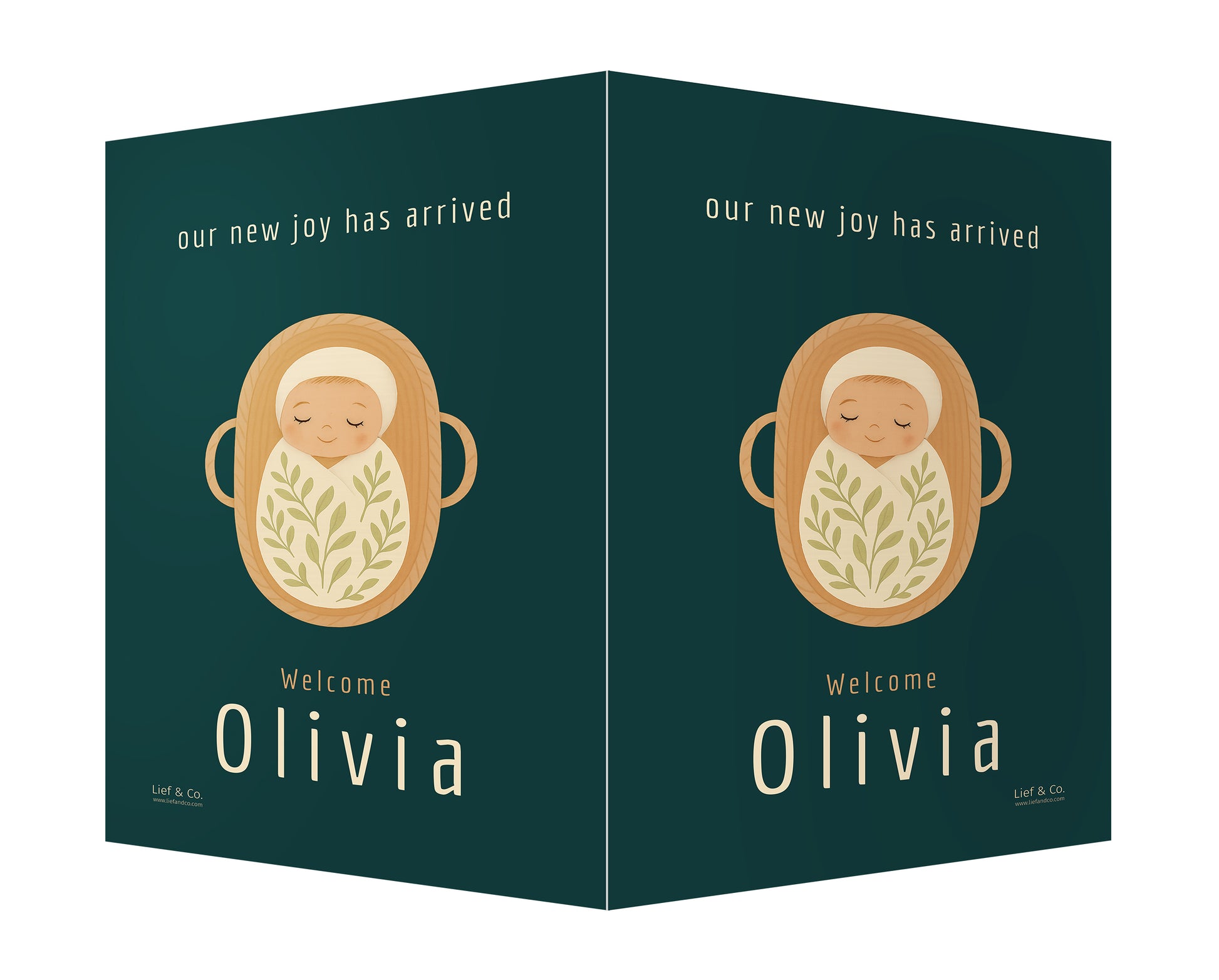 A joyful birth announcement sign featuring a swaddled baby in a leafy green wrap, peacefully resting in a rustic basket. With its crisp white backdrop and nature-inspired details, this customizable design is a fresh and timeless keepsake to celebrate your little one’s arrival.