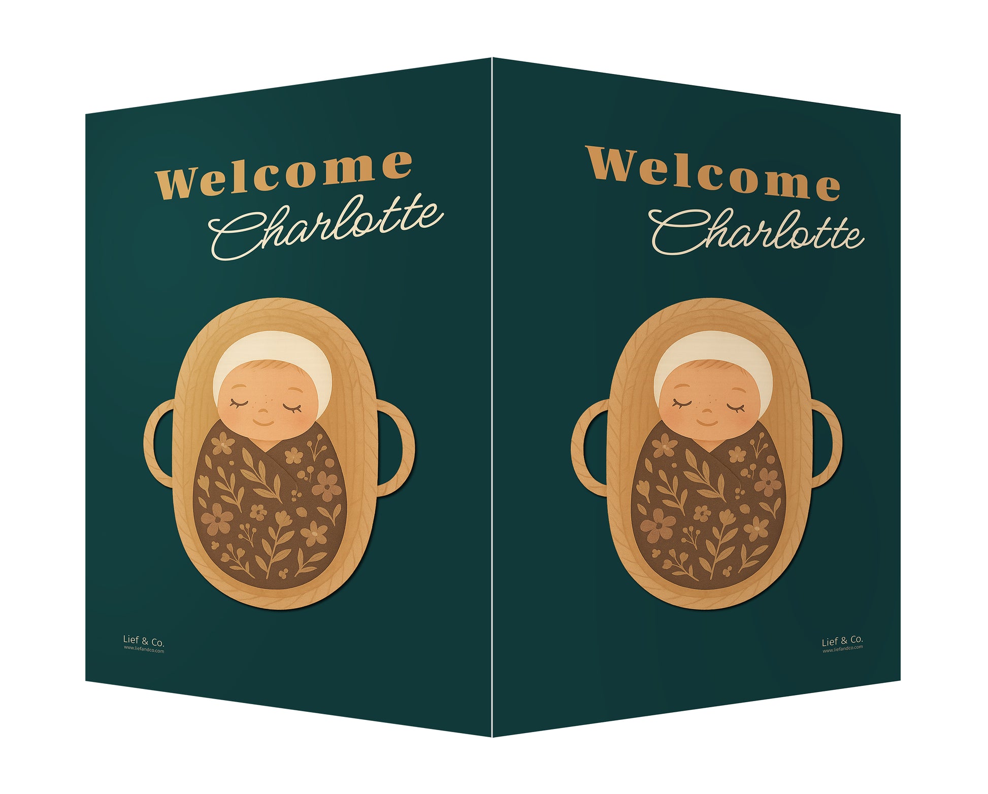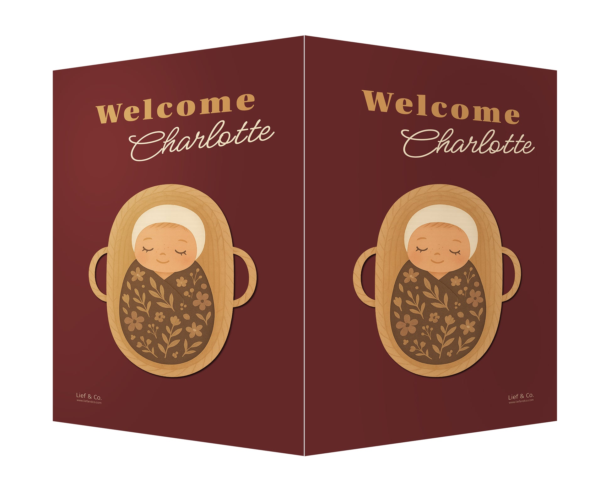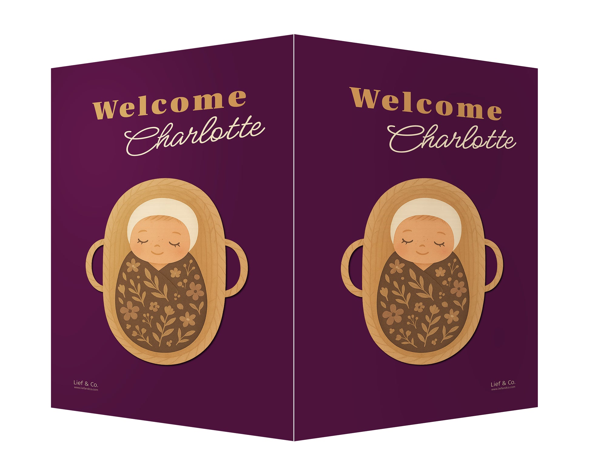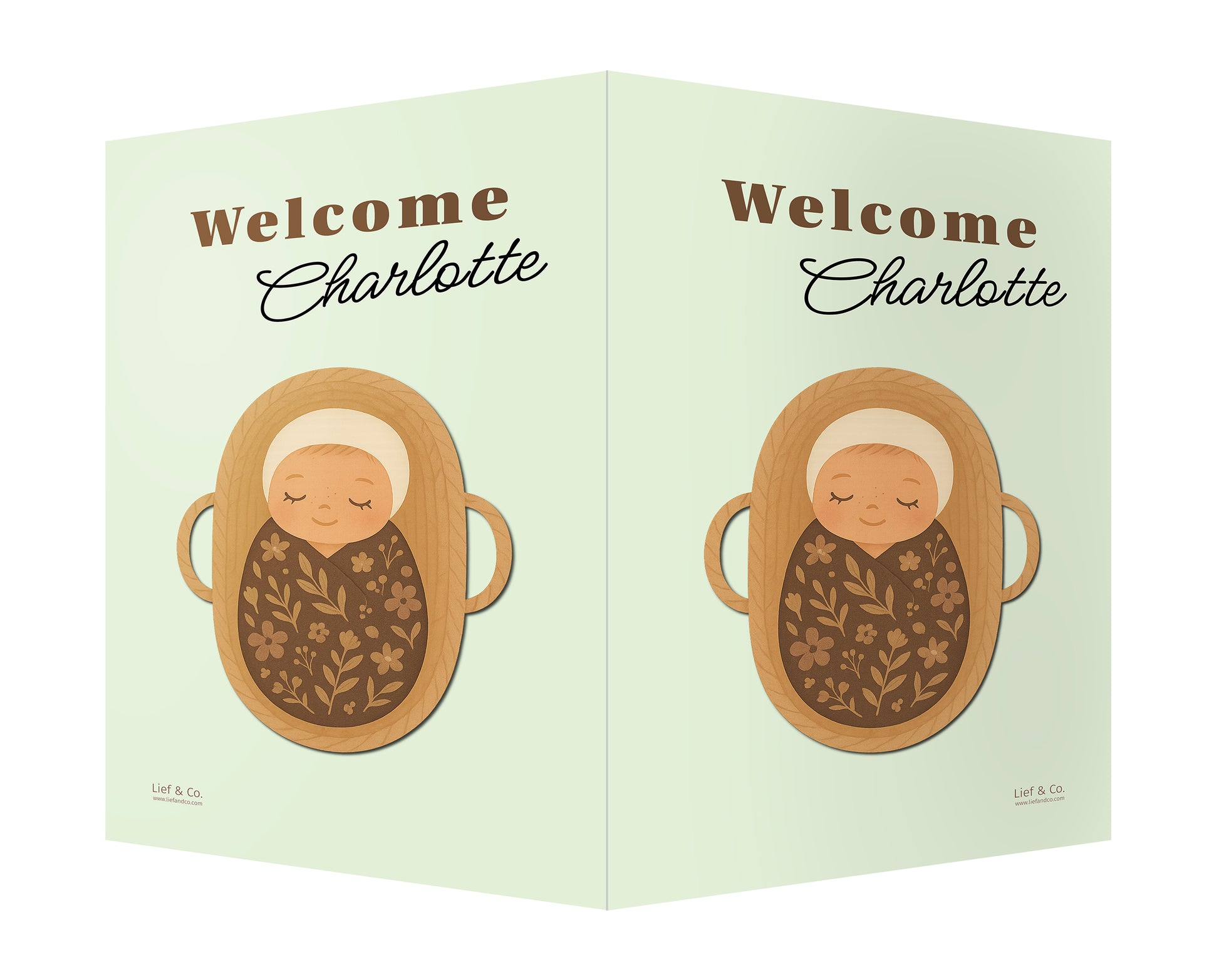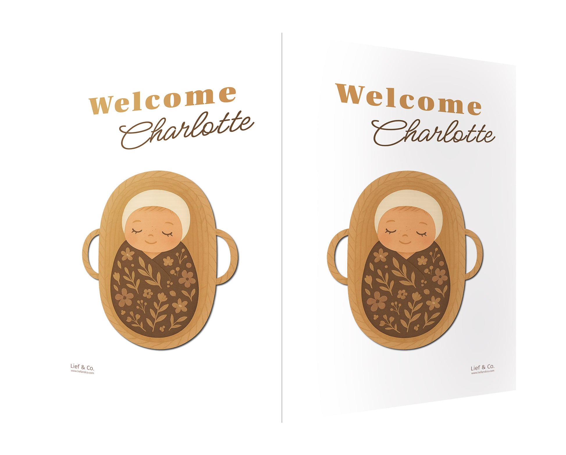 A cozy birth announcement sign featuring a swaddled baby in a rustic basket with a floral-patterned wrap. With earthy tones and natural textures, this customizable design adds warmth and charm — the perfect keepsake to celebrate your little one’s arrival.