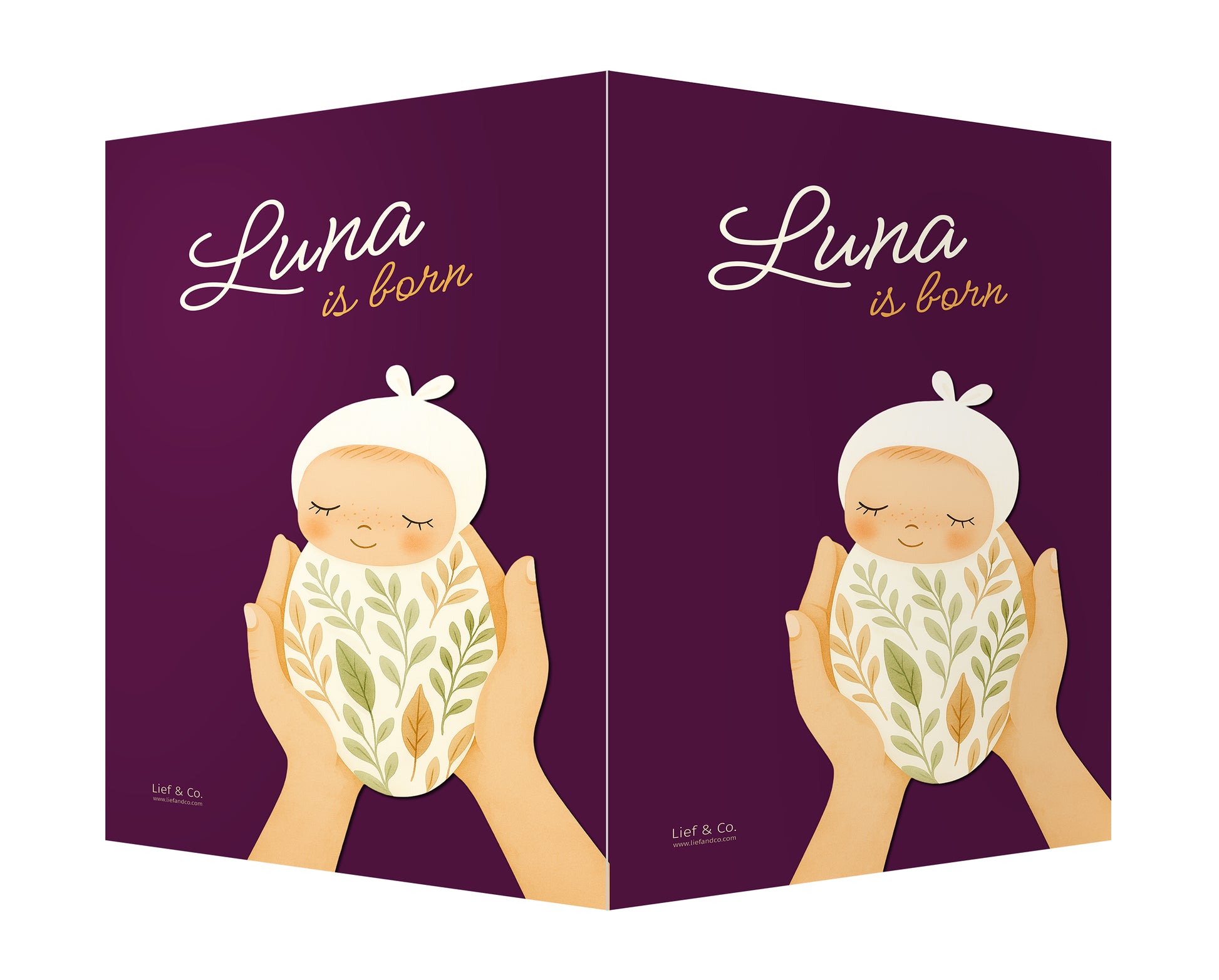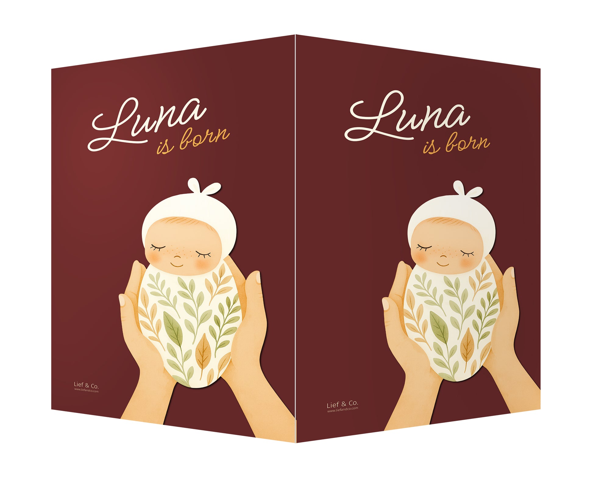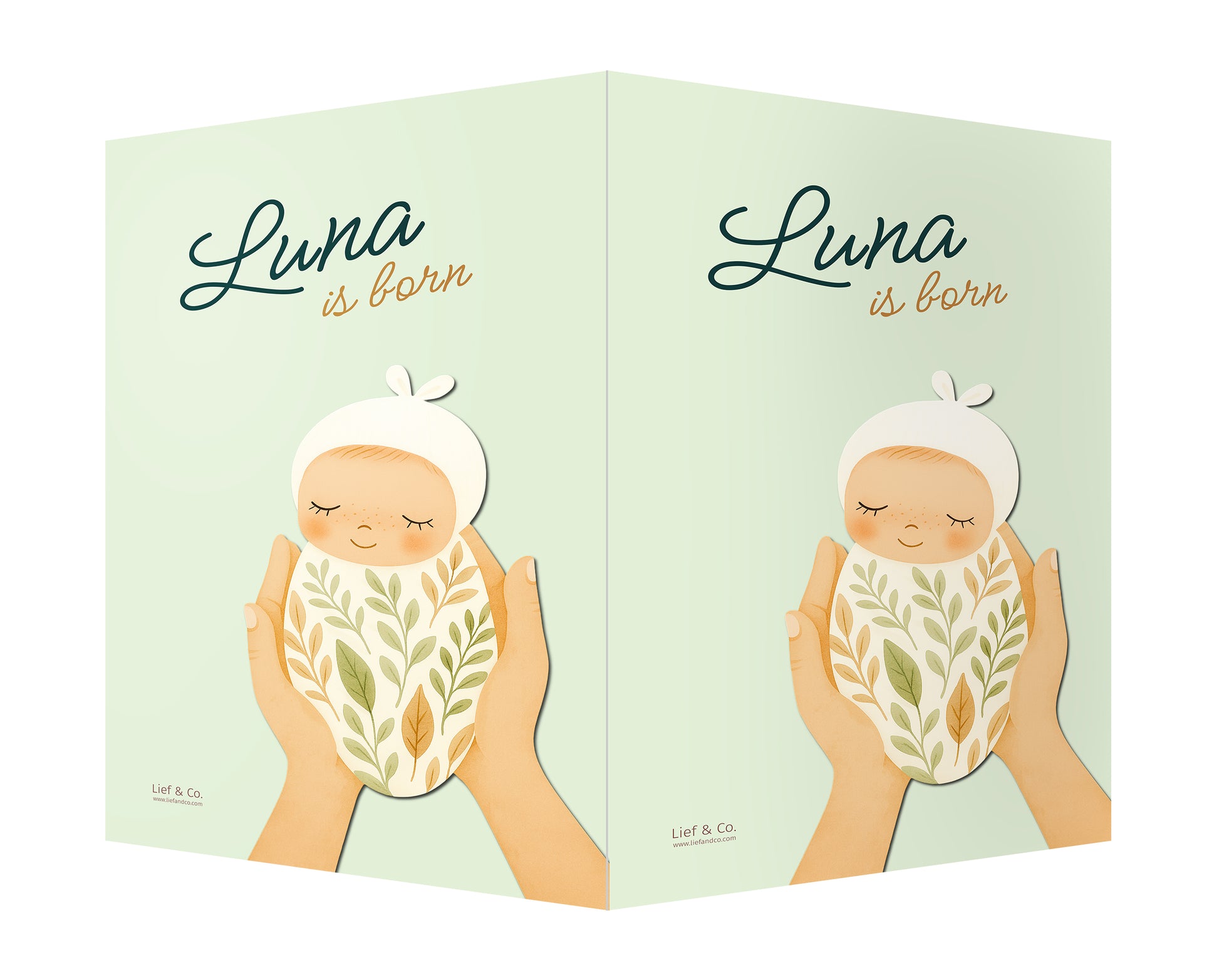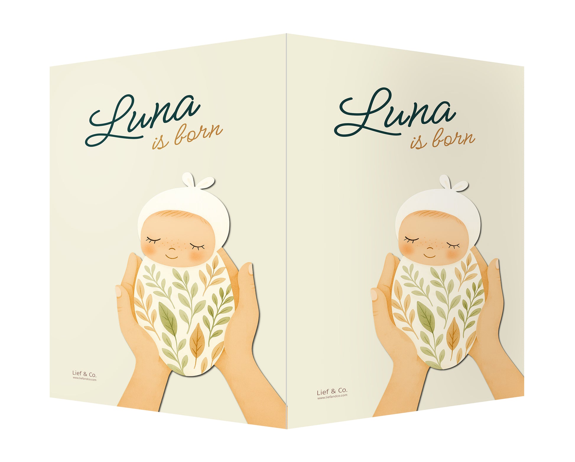 A heartfelt birth announcement sign featuring a swaddled baby in a leafy botanical wrap, cradled by gentle hands. With its warm natural tones and tender design, this customizable print is a beautiful keepsake to celebrate your little one’s arrival.