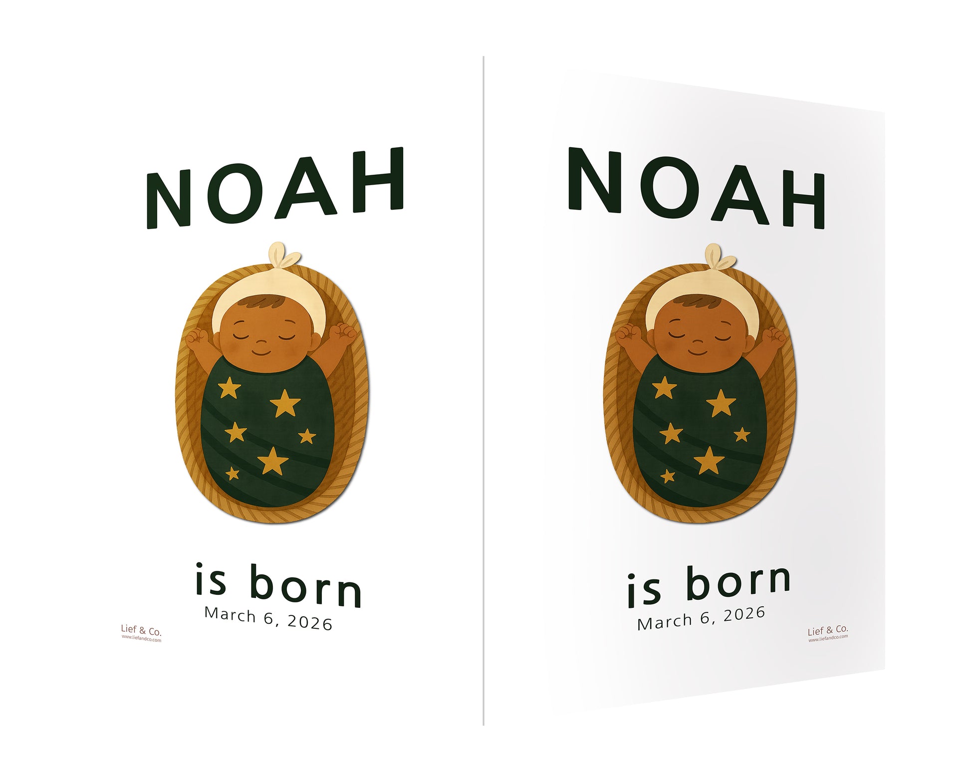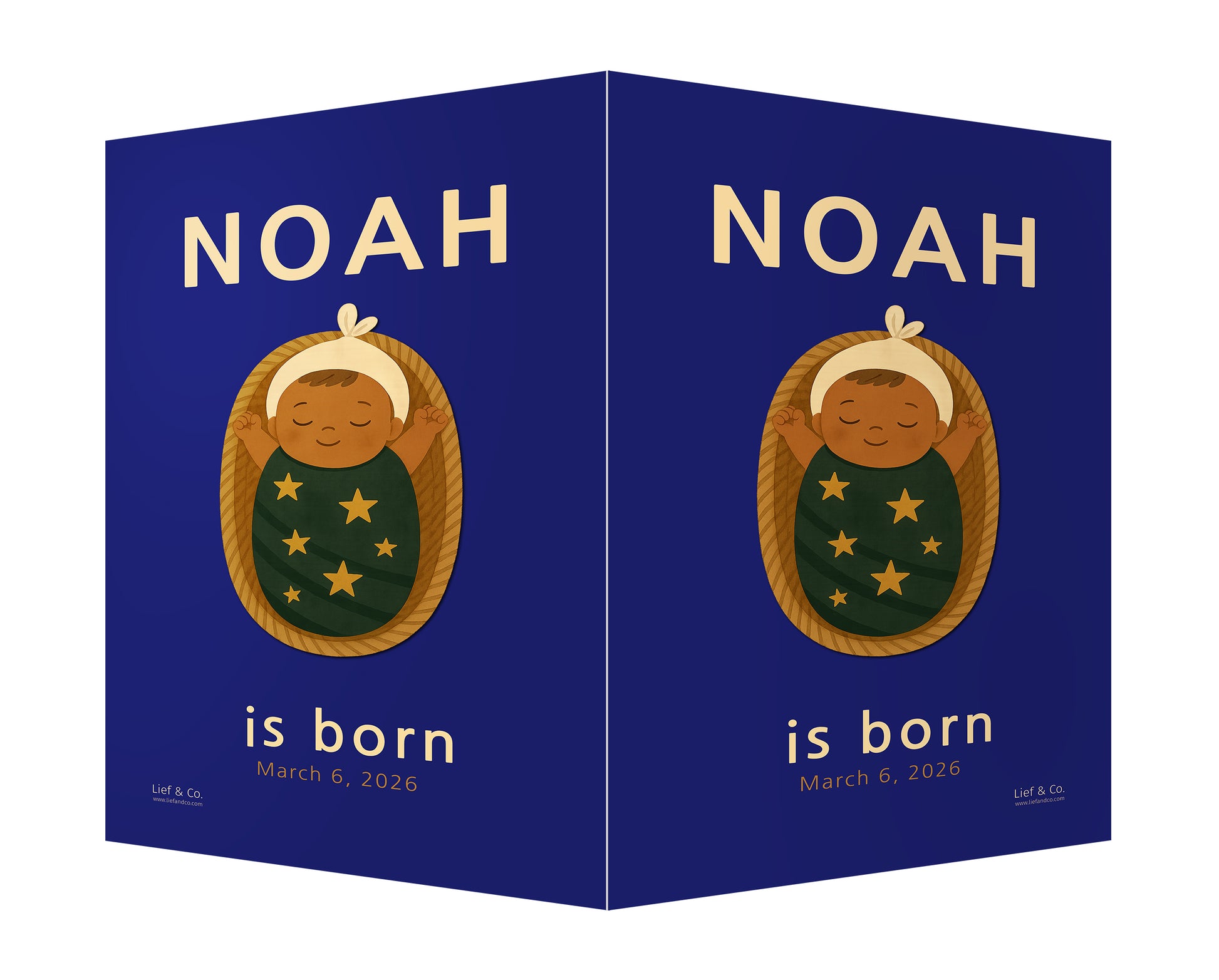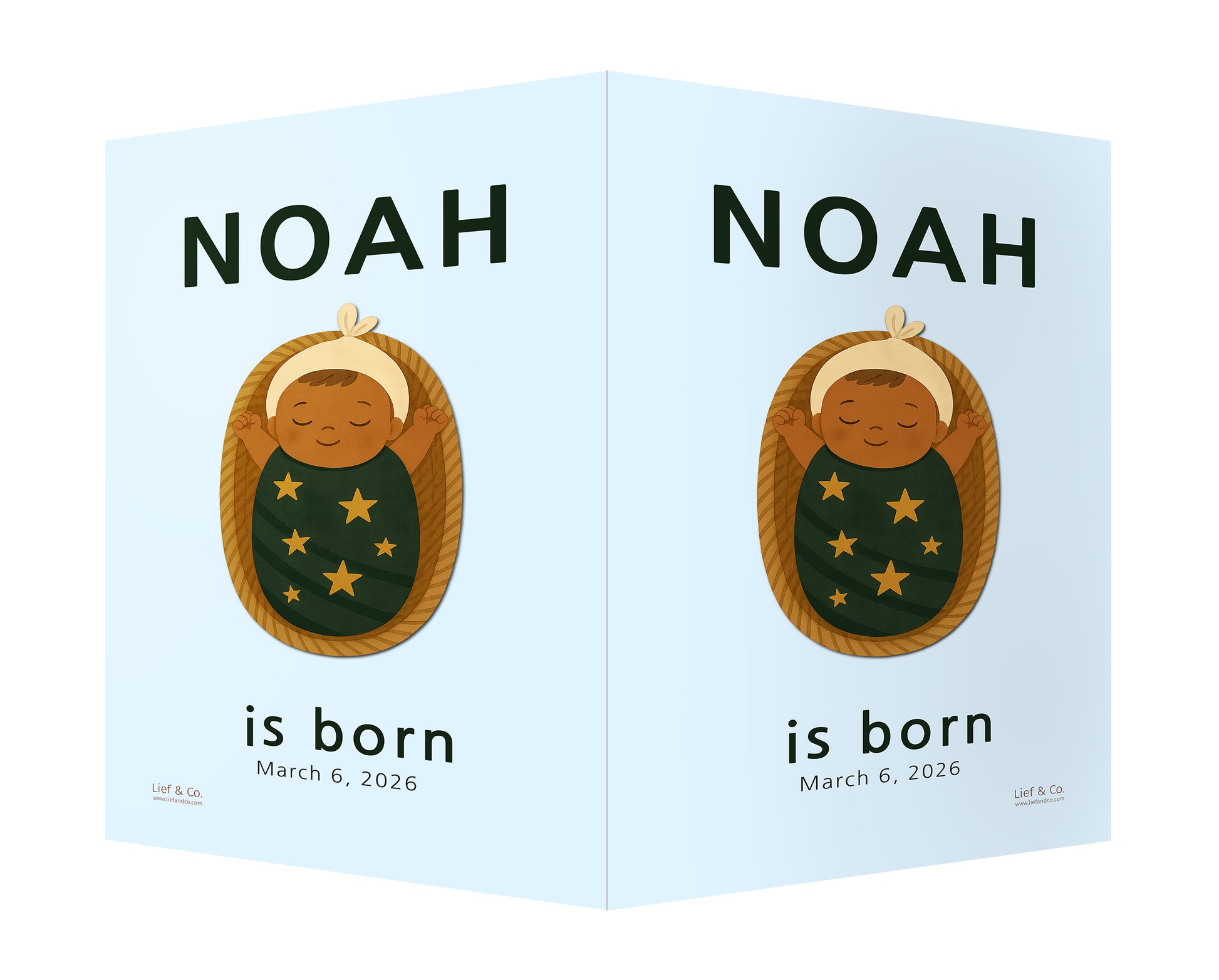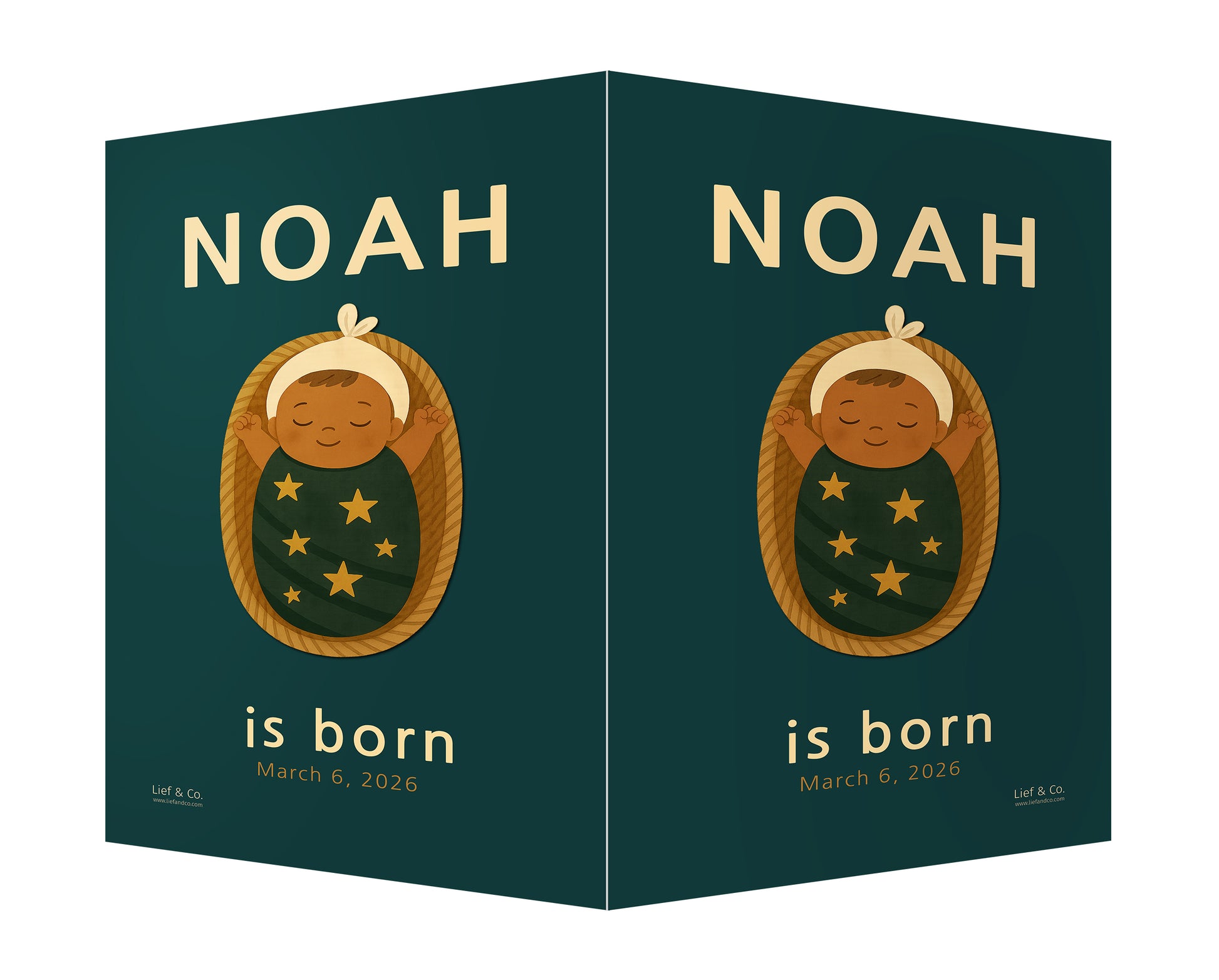 A charming birth announcement sign featuring a swaddled baby wrapped in a starry blanket against a fresh mint green backdrop. This customizable design blends playful details with modern style, making it the perfect keepsake to celebrate your little one’s arrival.