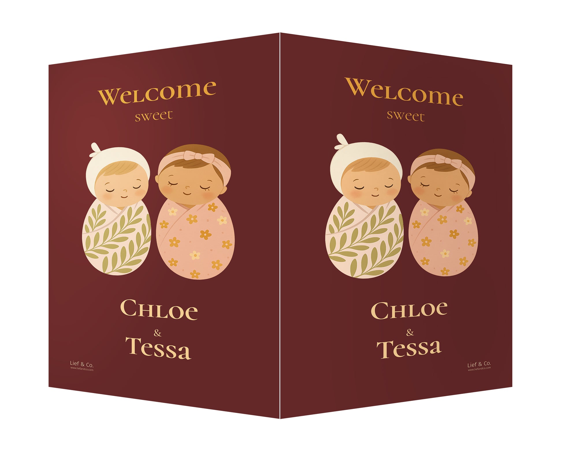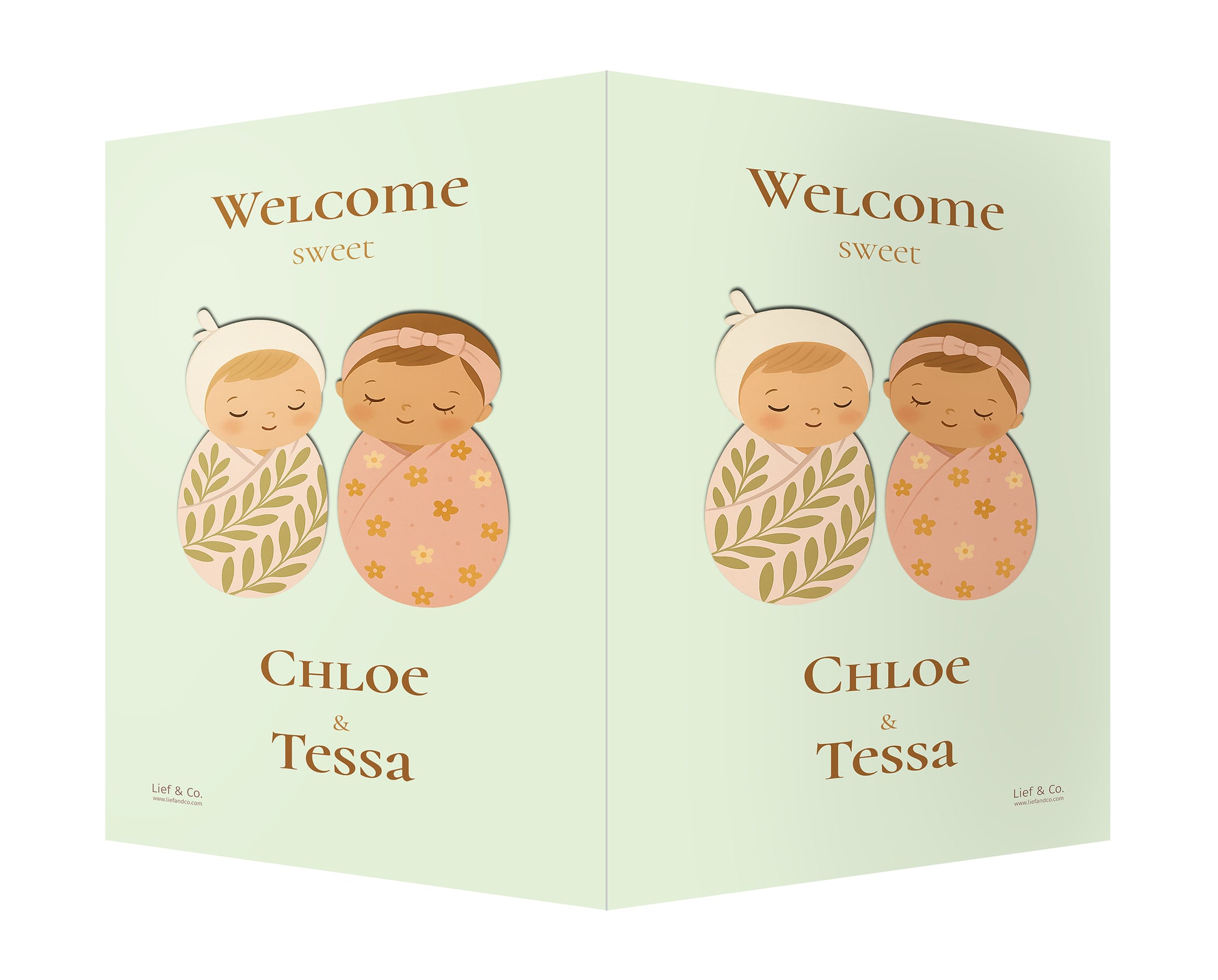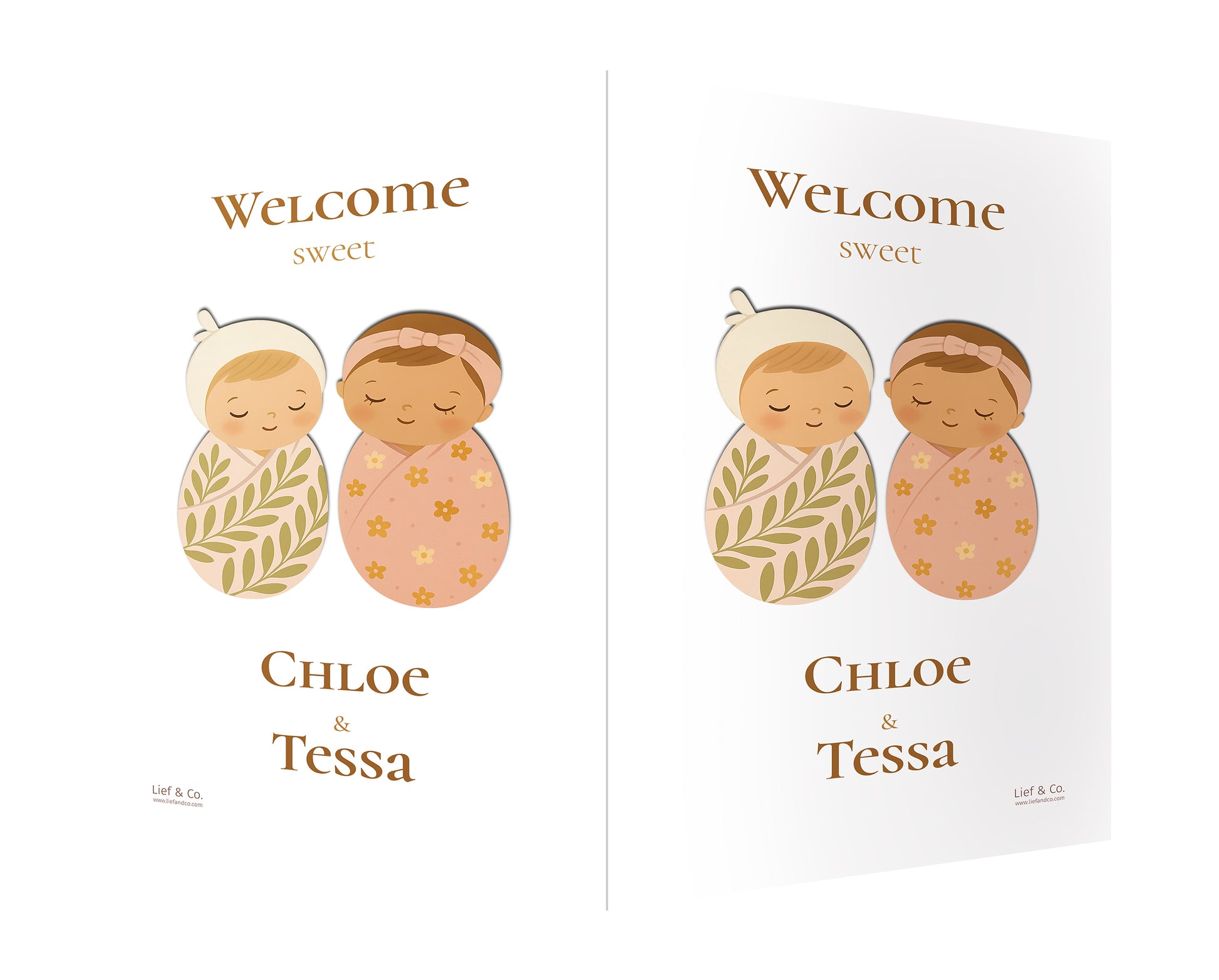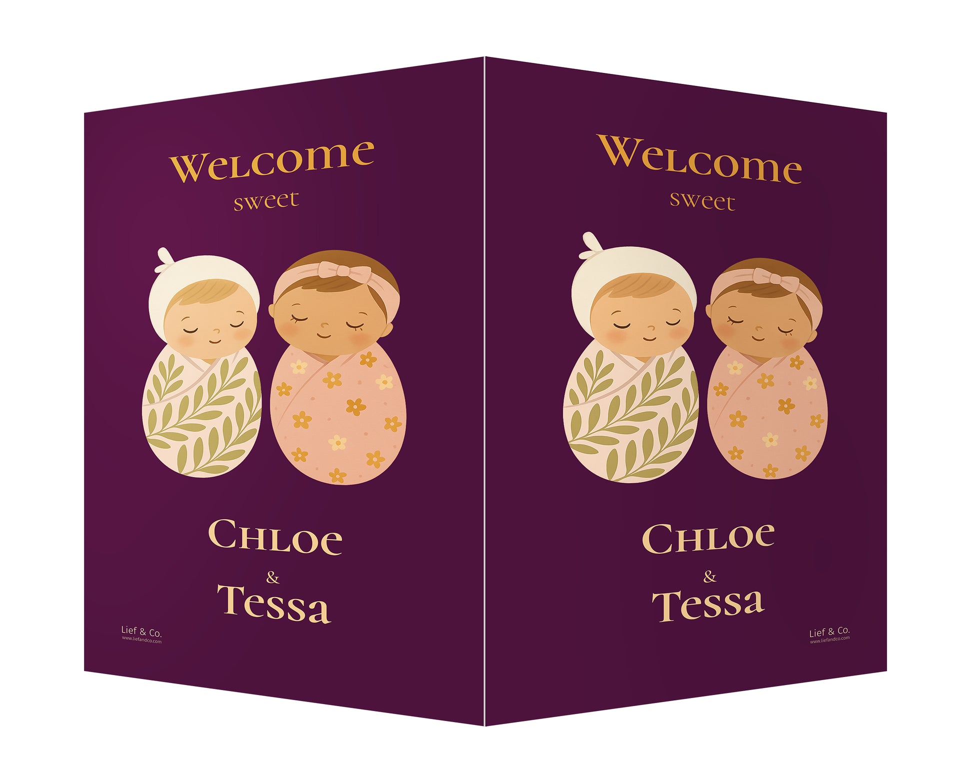 Celebrate the arrival of two little blessings with our Sweet Harmony birth announcement sign. Featuring a delicate illustration of twins wrapped in floral and leafy swaddles, this design symbolizes love, balance, and the beauty of new life. Perfect for your window, it’s a tender way to share your joy with family, friends, and neighbors.